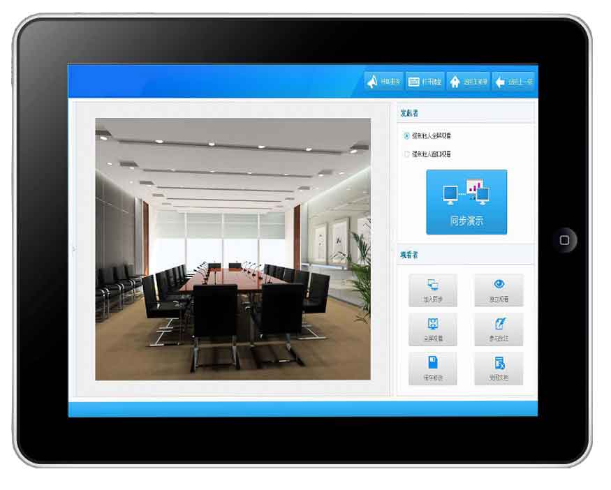 同步演示模式:可实现与演示电脑完全同步,支持有线或无线联网,相当于传统升降屏功能。